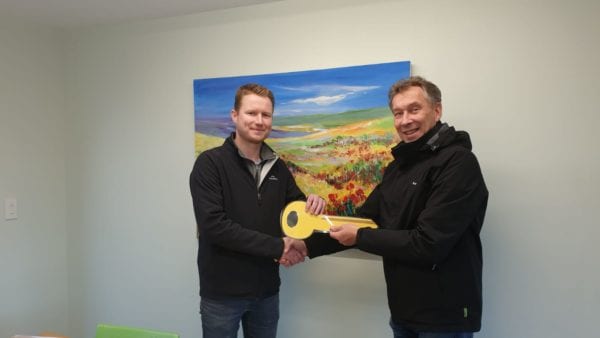 Cees (right) symbolically hands over the key to Jan Jaap (left). Jan Jaap will be in charge of the company in New Zealand in 2020