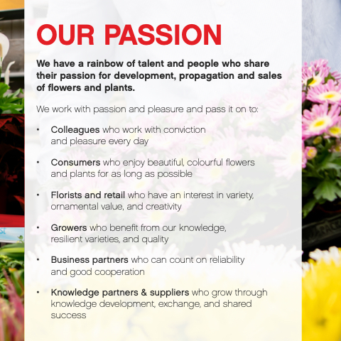 We have a rainbow of talent and people who share their passion for development, propagation and sales of flowers and plants.