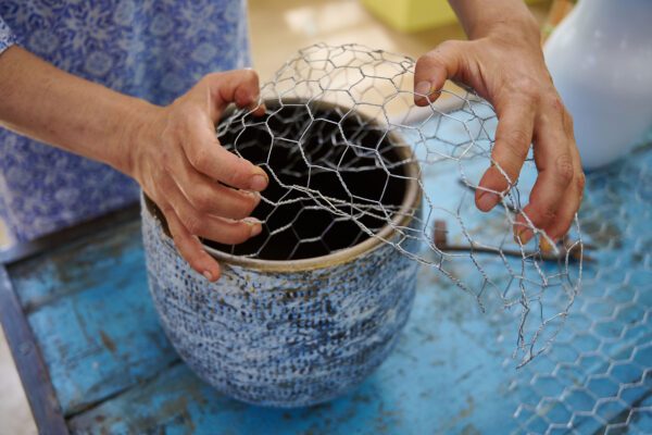 Step 1: Cut a square piece of chicken wire and shape it into a sphere by pushing the ends together. Clamp the ball securely into the pot. Please note: the flower stems will need to be supported by the wire both at the top and bottom.