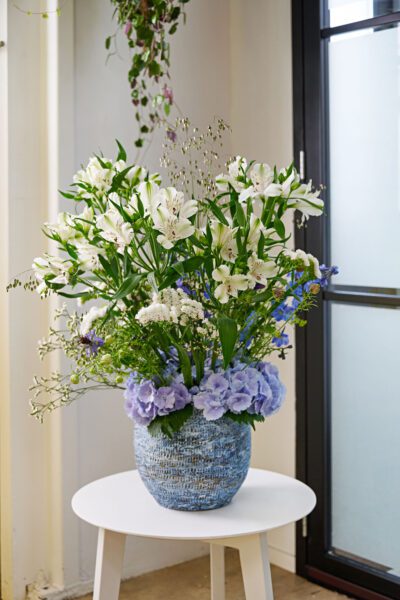 Flowers: Alstroemeria Winterfell, supplemented with white and blue summer flowers: Statice, Hydrangea, Nigella, Delphinium, Alchemilla and Briza media