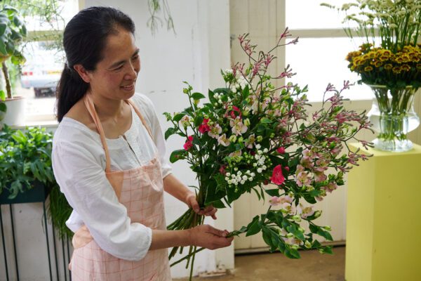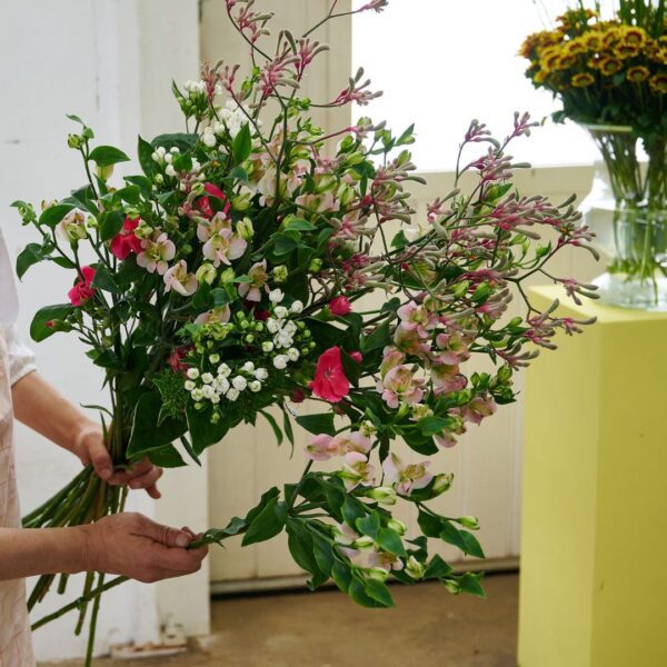 Step 4: Add increasingly shorter flowers towards the outside. Place the Bouvardia flowers slightly higher in the bouquet, so that the stems do not sit too deep in the water. This will improve the bouquet’s shelf-life.