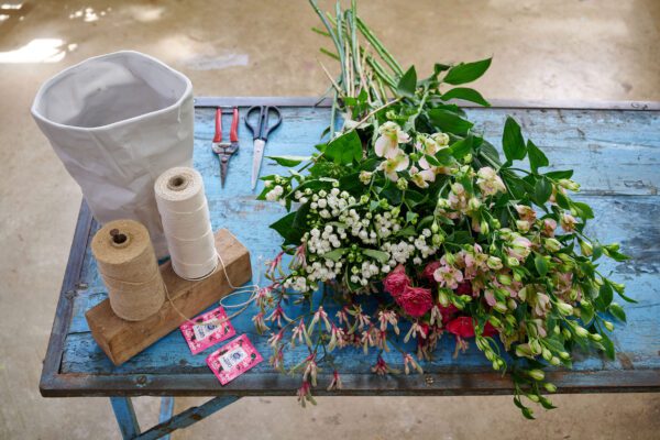Step 5: Trim the stems. Tie the bouquet together with the twine and place it in the vase (make sure that the Bouvardia flowers that you have positioned slightly higher touch the water, but do not place them too deeply).