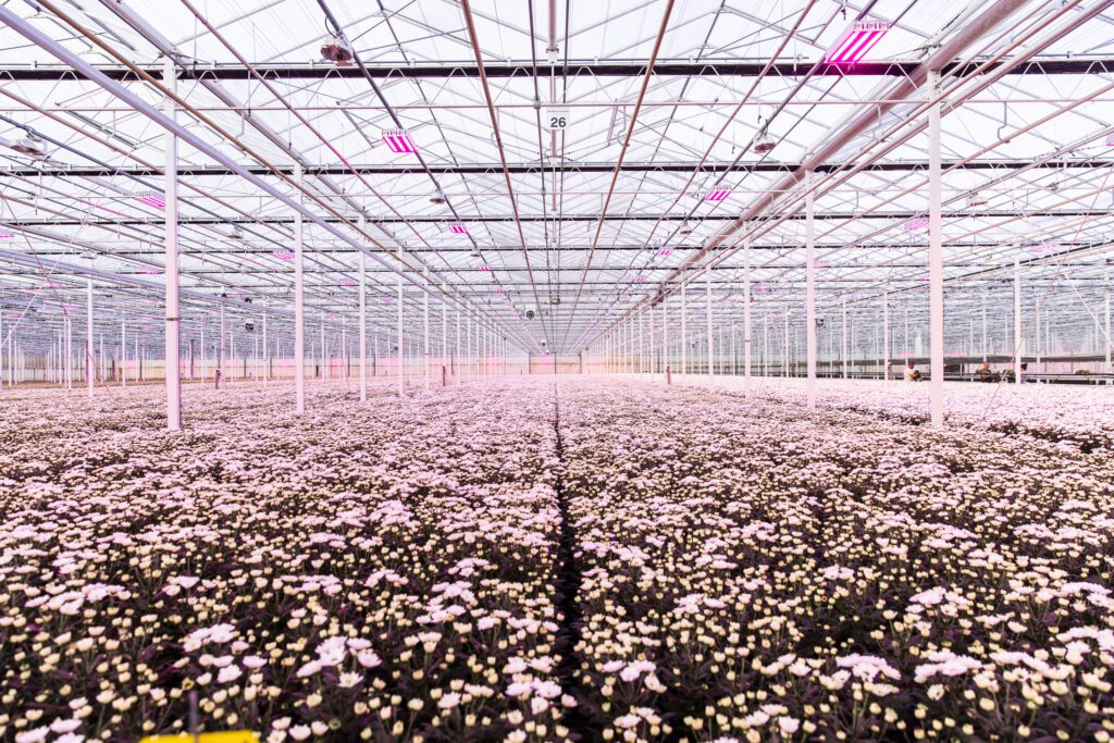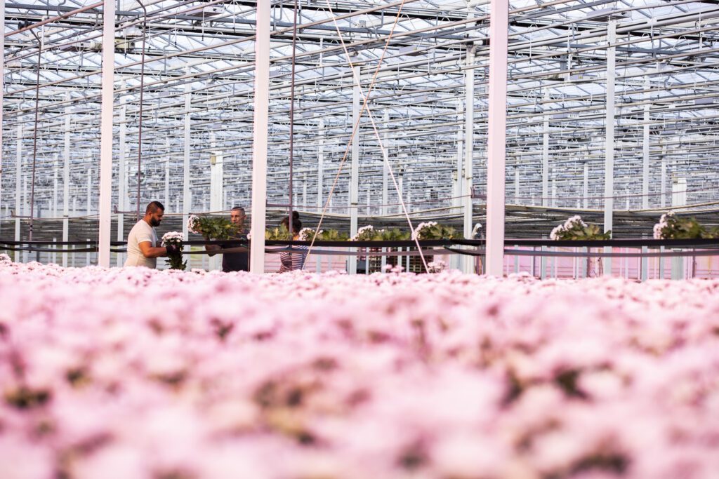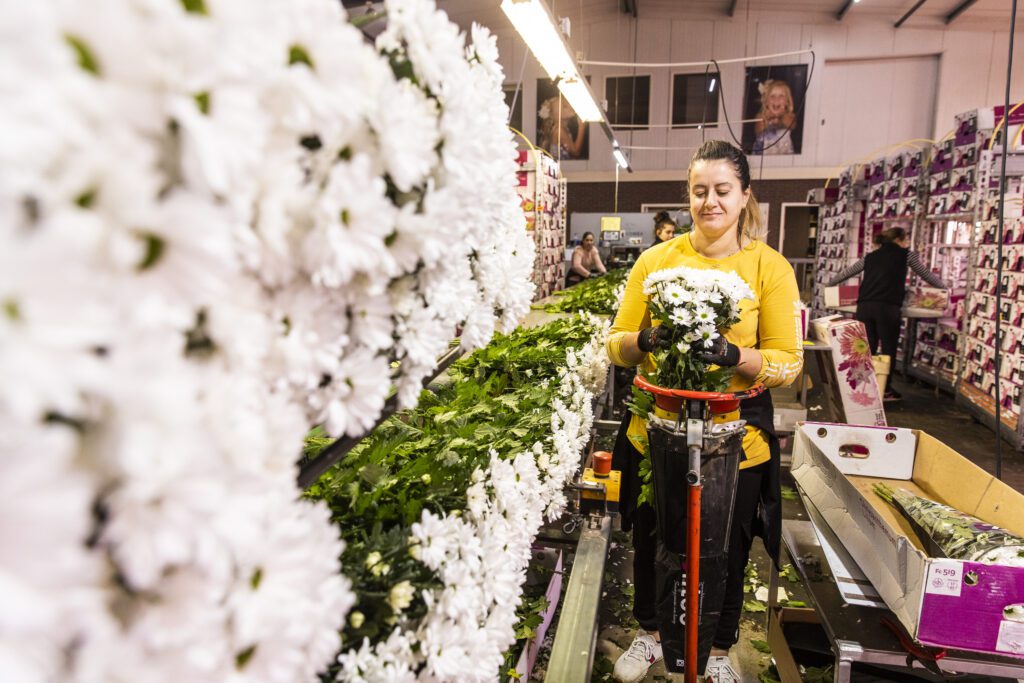 A full greenhouse bay of Chic flowers is harvested almost every day (depending on the time of year). The next lot of Chic plants are often planted the very next day, to be picked again in 10 weeks. Most Chic chrysanthemums are harvested for European florists.