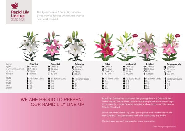 These days the lily market faces major challanges and we would like to respond to these challanges with our rapid lily line-up. Especially for you, as breeder, Royal Van Zanten has shortened the growing time of some Oriental lilies. These rapid lilies have a cultivation period less than 80 days*. Compare this to other Oriental varieties such as Sorbonne (110 days) or Siberia (135 days).