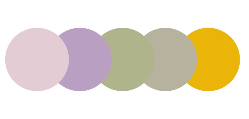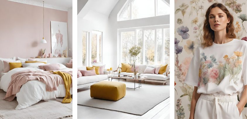 Het geel schijnt ook zijn licht op de andere kleuren in het palette, waardoor zachte moderne pastel kleuren ontstaan. “Alsof deze kleuren in een lichtbad van de zon hebben gelegen.”