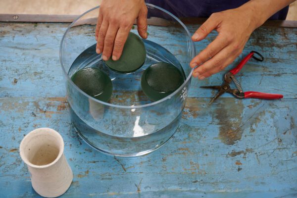 Stap 1: Vul de glazen schaal met water. Leg de steekschuimbollen óp het water, zodat ze zich rustig kunnen volzuigen met water.