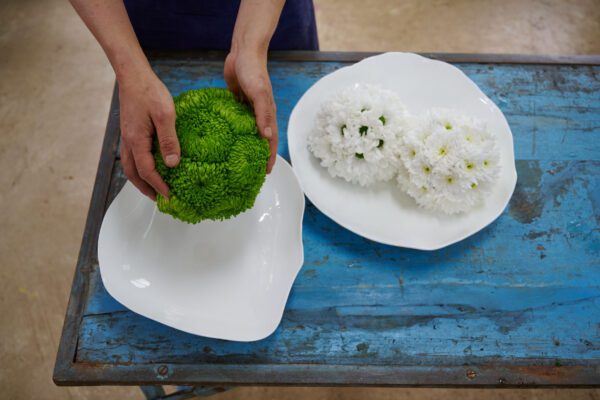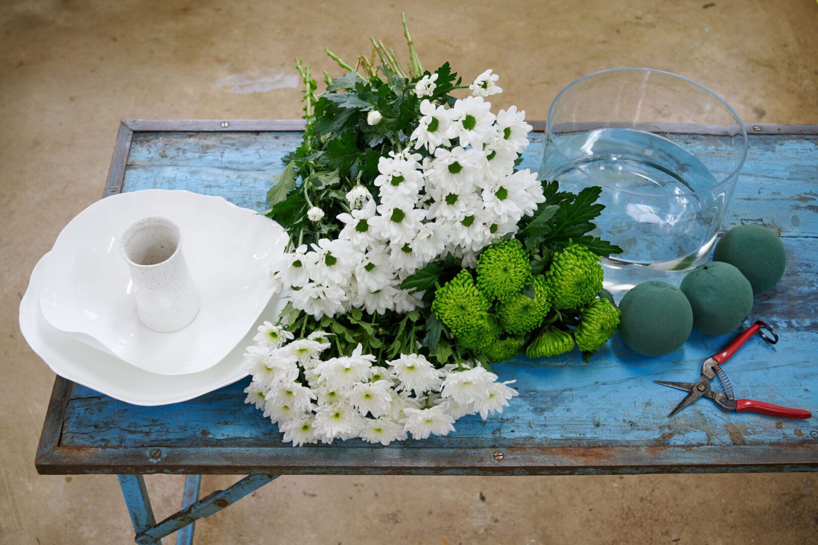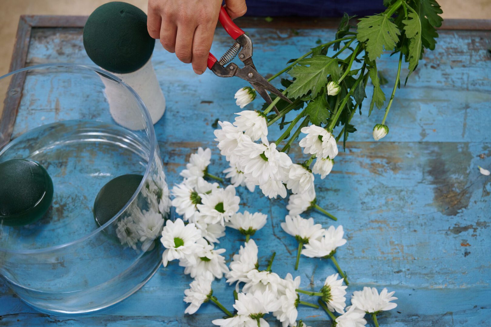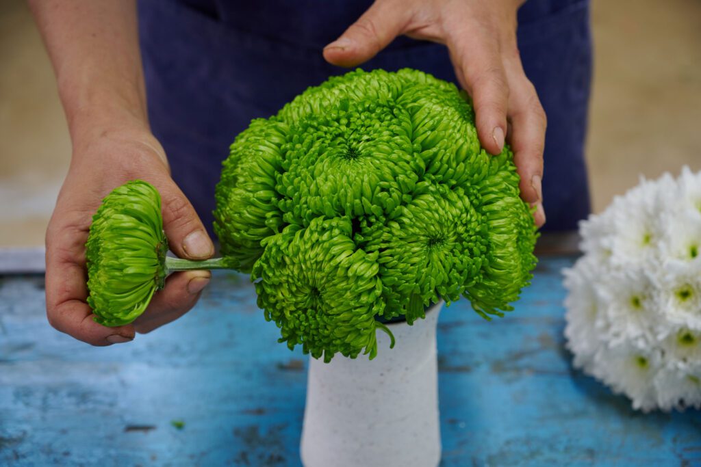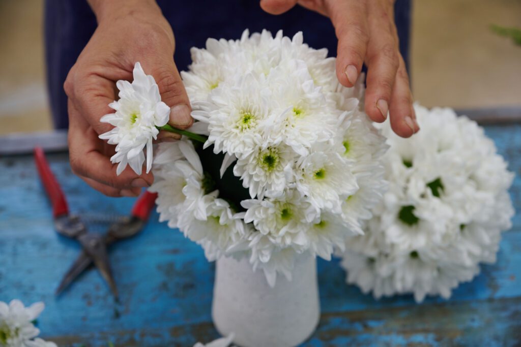 Stap 2: Knip de chrysanten kort af (je steekt de stelen straks ongeveer 3 cm in het steekschuim). Schuin afknippen zorgt ervoor dat ze makkelijker steken.