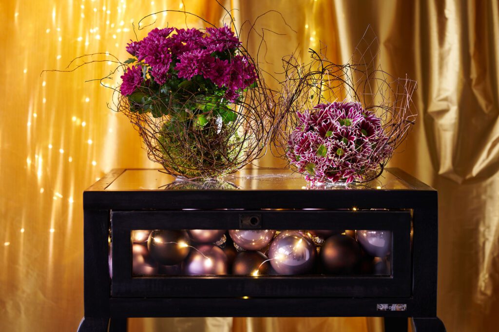 Met potchrysanten kun je eenvoudig een sterk kerstconcept neerzetten. Denk aan: