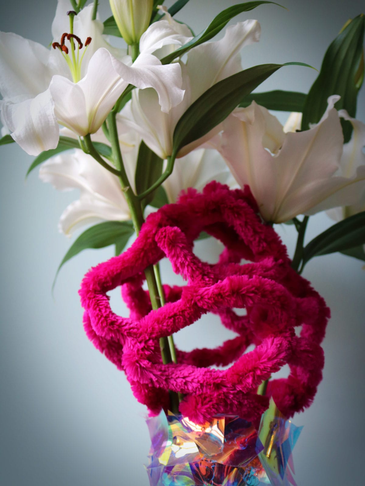 Et voila: een prachige en sierlijke bloemenkroon met de bijzondere dubbel bloemige Lelie ‘Sabor’ in de hoofdrol.