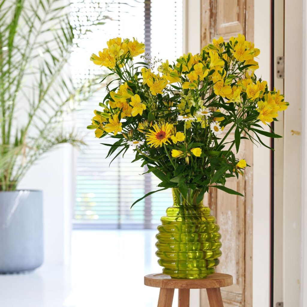 Groen staat symbool voor een frisse start en werkt stres verlagend. Het is een optimistische kleur die perfect past bij de lente. Door groen te gebruiken in lenteboeketten of door een enkele bloem in een glazen vaasje te plaatsen, breng je een ultiem lentegevoel in huis! Wat wil je nog meer?