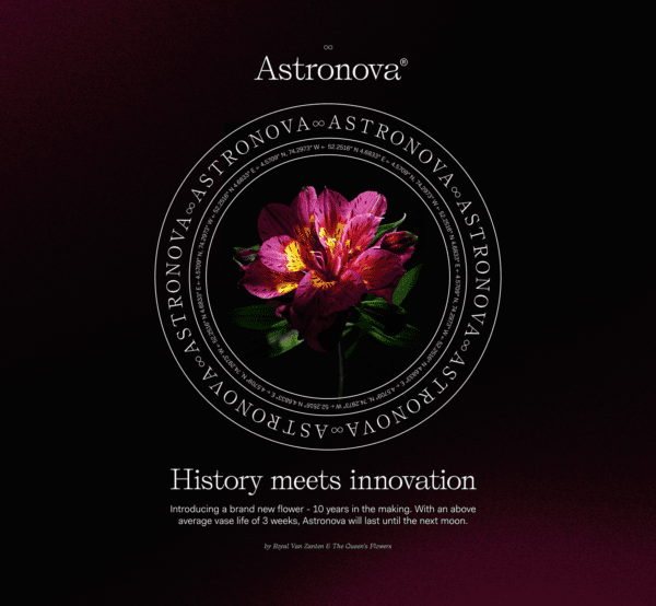 In de bloem, naamgeving en branding van Astronova® worden wetenschap en kunst verenigd. De ontwikkelaars zijn geïnspireerd door de helderheid van de sterren en de rijke kleurschakeringen uit schilderijen van de oude meesters. Die inspiratie komt tot uiting in de introductie van Astronova®.
